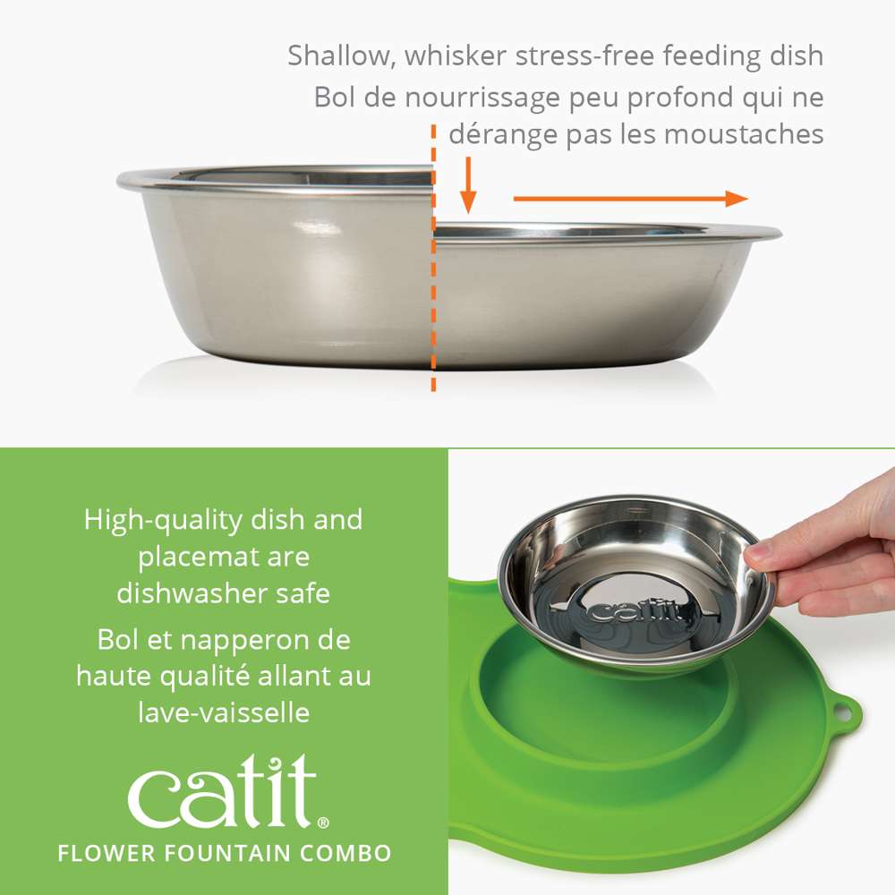 - Napperon en silicone souple et bol de nourrissage en acier inoxydable inclus;