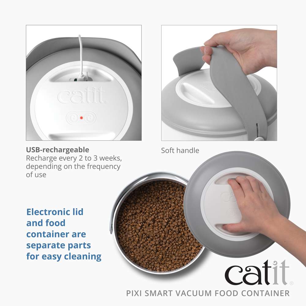 Le contenant intelligent sous vide Catit PIXI pour nourriture comprend une pile intégrée qui nécessite d’être rechargée seulement toutes les 2-3 semaines (selon l’usage); donc, il se range parfaitement dans une armoire ou le garde-manger. De plus, il est muni d’une poignée souple pratique et comprend une pelle à nourriture agencée.
