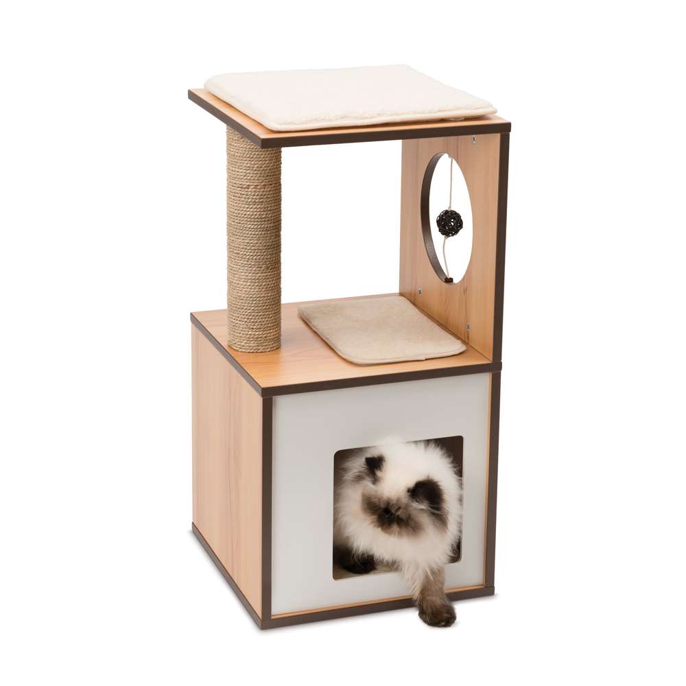 De conception compacte et moderne, le petit meuble Vesper Box est équipé d’un cube douillet pour la sieste, de surfaces de détente, d’une balle et d’un poteau à griffer. Il constitue donc un lieu de repos et de jeu dont tous les chats rêvent.