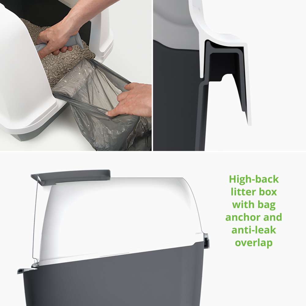 Thanks to the high back and overlap mechanism, litter is kept inside the litter box. The rounded edges and wide opening make for easy scooping and cleaning.
