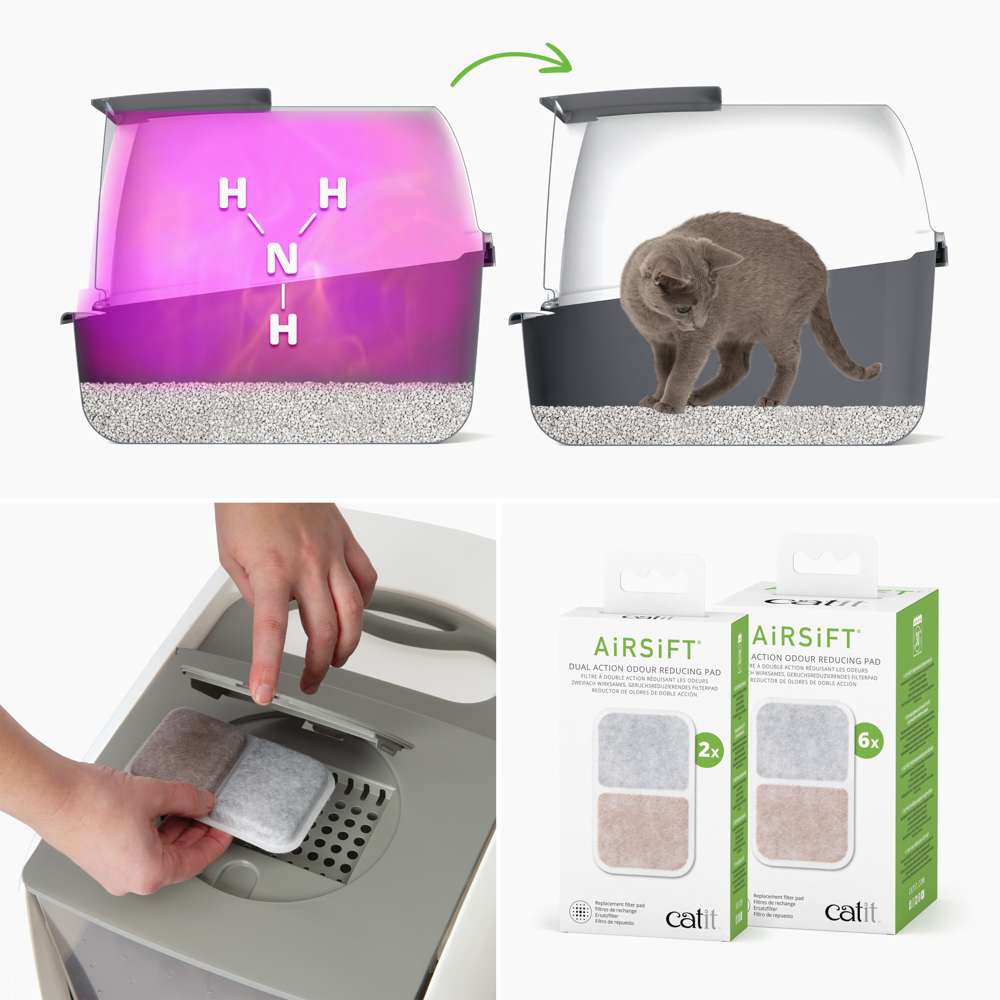 Insert the included Catit Airsift Dual Action Odour Reducing Pad into the top compartment for 1 month of cat-friendly odour reduction. Refill Catit Airsift filter pads are sold separately.