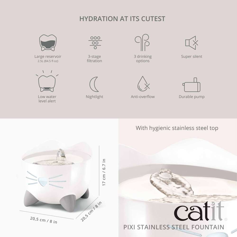 The Catit PIXI Fountain provides your cat with a continuous source of fresh, purified water. Running water encourages cats to drink more, which helps prevent urinary tract diseases.