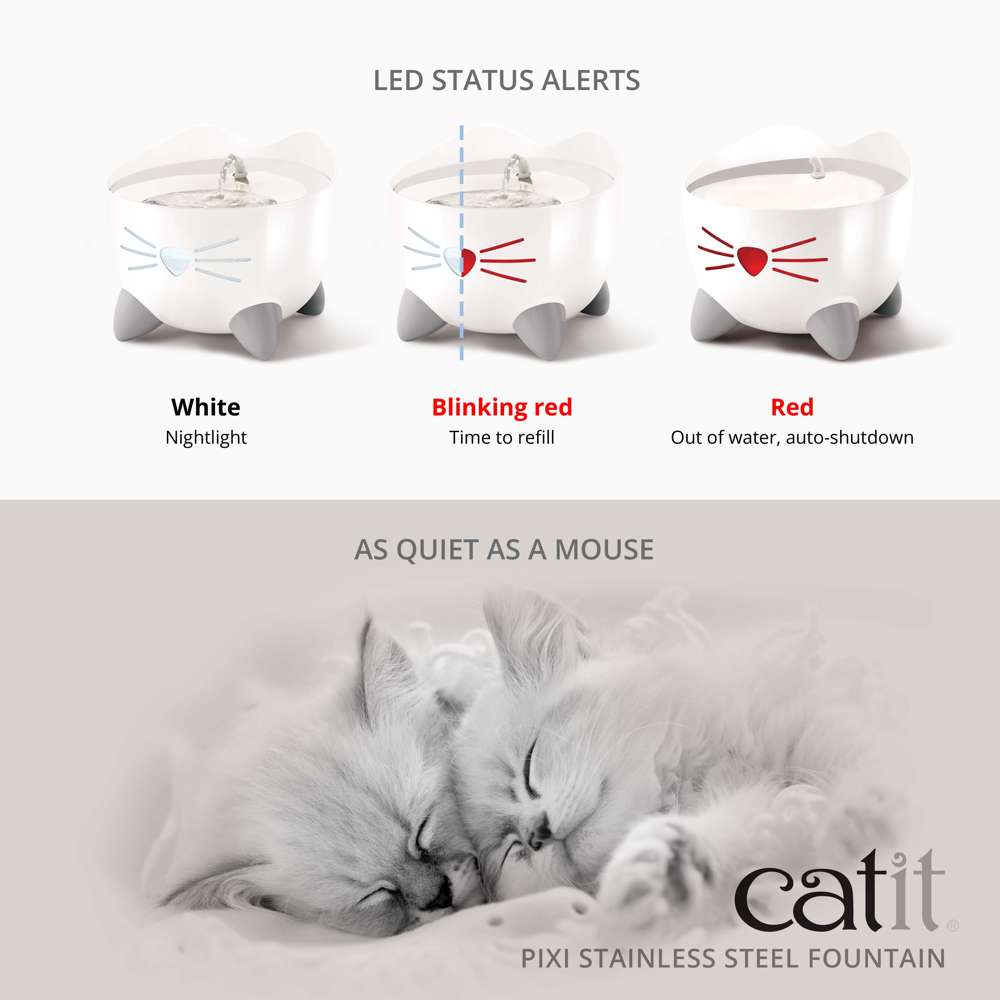 The Catit PIXI Drinking Fountain is strikingly cat-like in appearance, yet highly ergonomic and user-friendly. PIXI’s little paws make the fountain easy to pick up for refills, while the cute ears help prevent water spills and splashes. Even PIXI’s nose and whiskers are super convenient and serve as a backlit water level window.