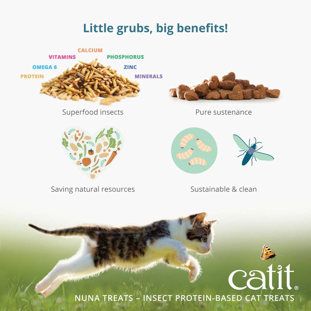 Catit Nuna treats include whole Hermetia Illucens grubs, a true superfood bursting with protein, mixed in with loads of healthy ingredients!
